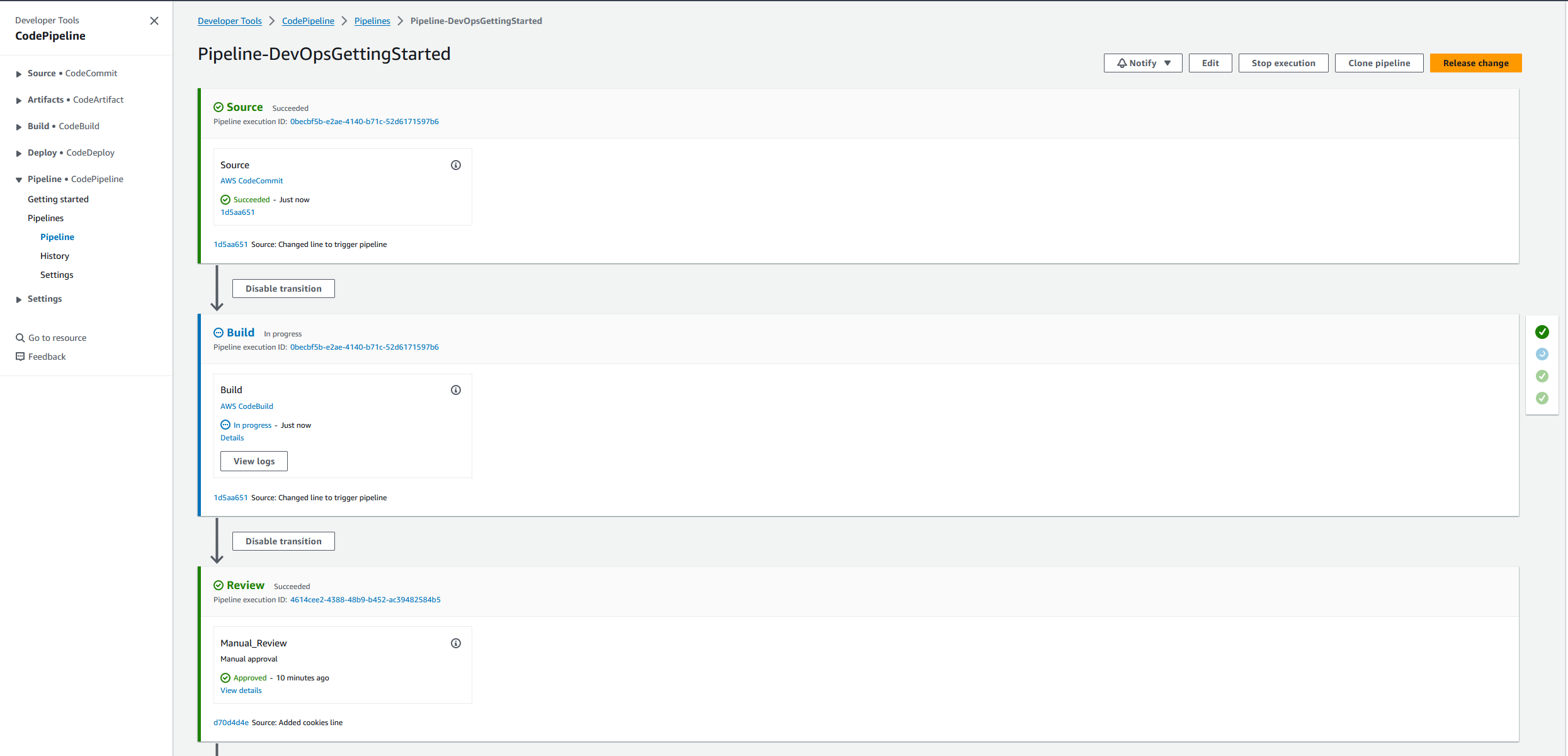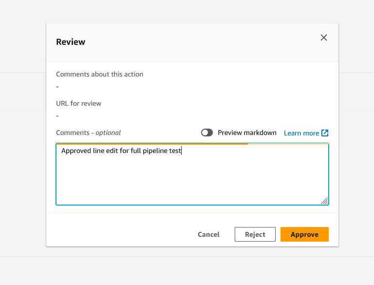 Then the CodePipeline enters the “Review” stage and waits for a user to review the changes (code commit and build status) for approval with a comment.