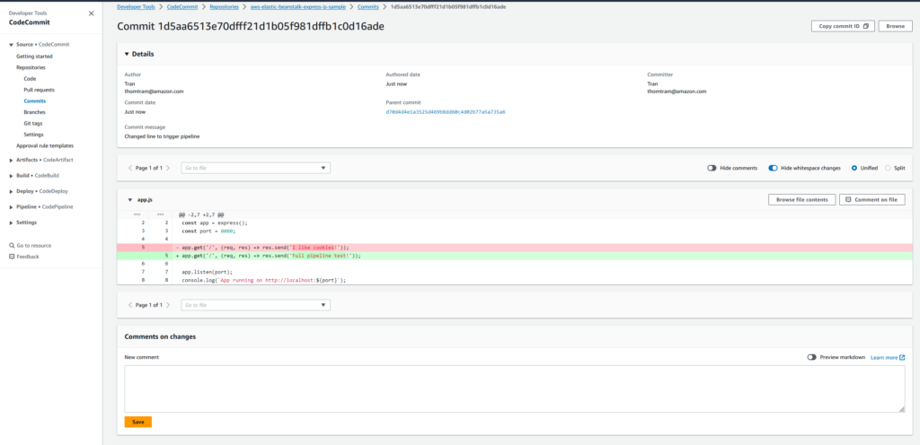 I made a change to the code repository AWS CodeCommit by editing the app.js with a new line and pushed the changes with git to trigger the “Source” stage in AWS CodePipeline.