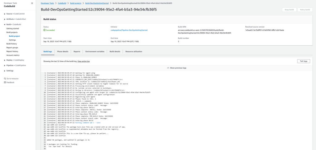 In this part of the stage, the node package manager (npm) will install all of the necessary package dependencies from the package.json file in the AWS CodeCommit repository.