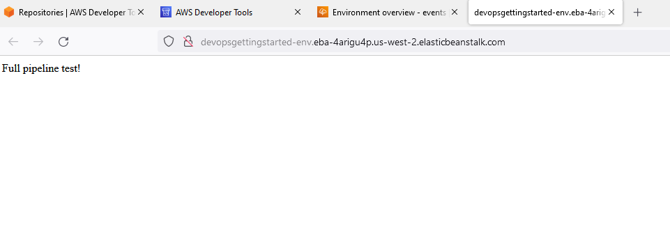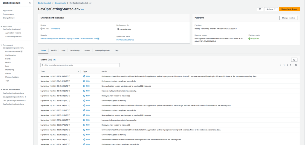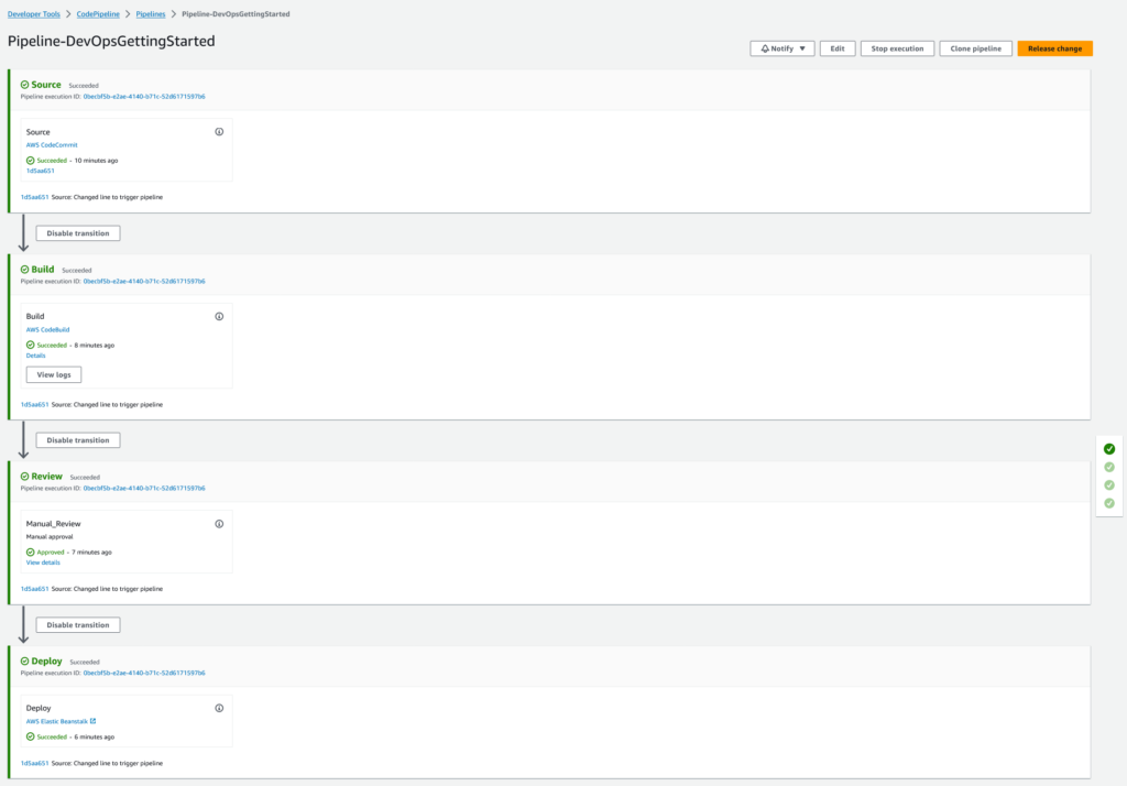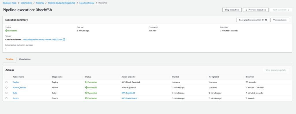 Finally, the pipeline transitions into the last stage “Deploy” to apply the changes to the final web application using Elastic Beanstalk. We see the environment is successfully updated in Elastic Beanstalk and completed.